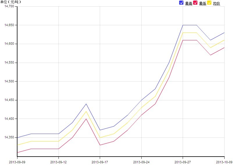 2013年10月9日長江現貨電解鋁價格14590-14630元/噸,較昨日漲20元/噸。