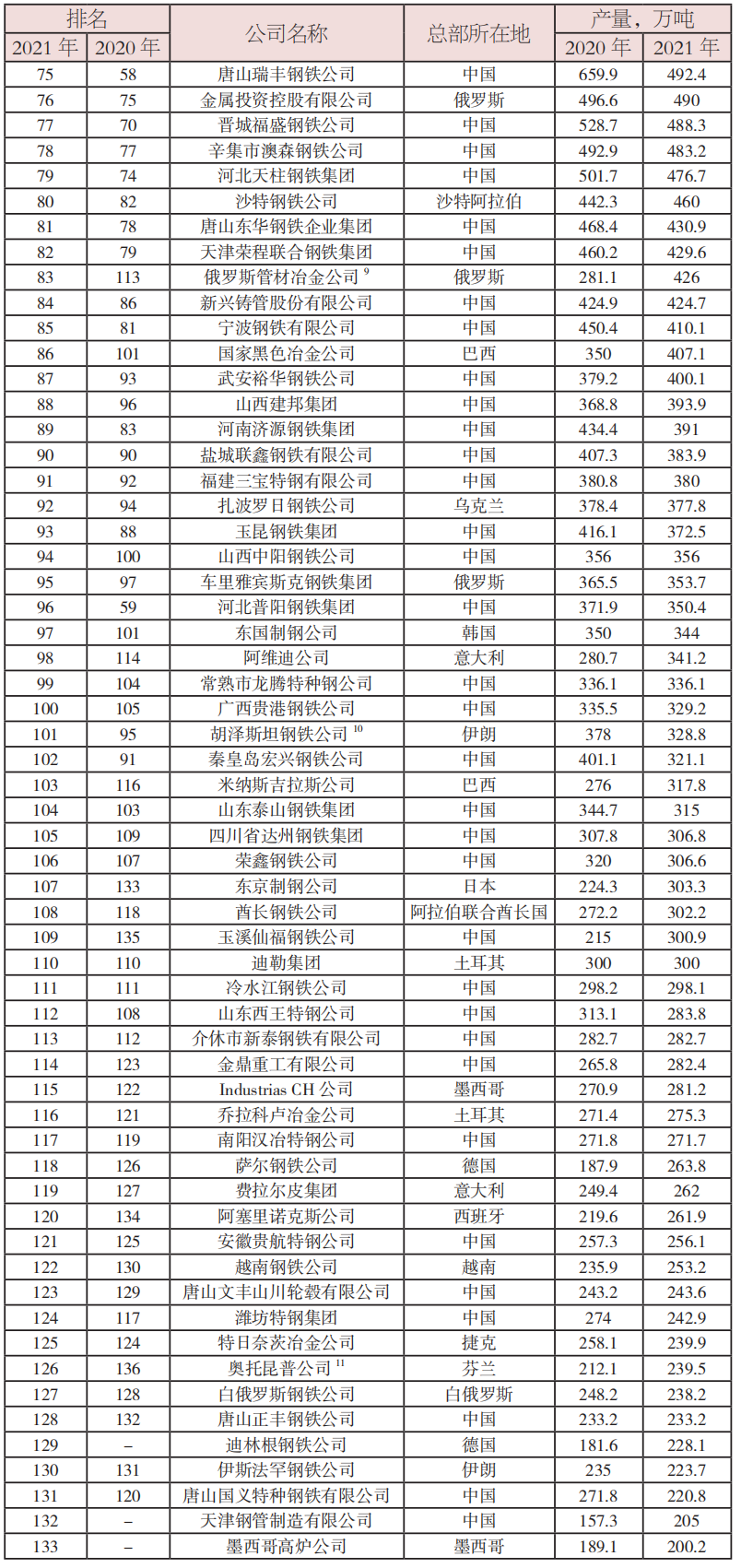 2021年全球鋼鐵企業(yè)粗鋼產(chǎn)量排名