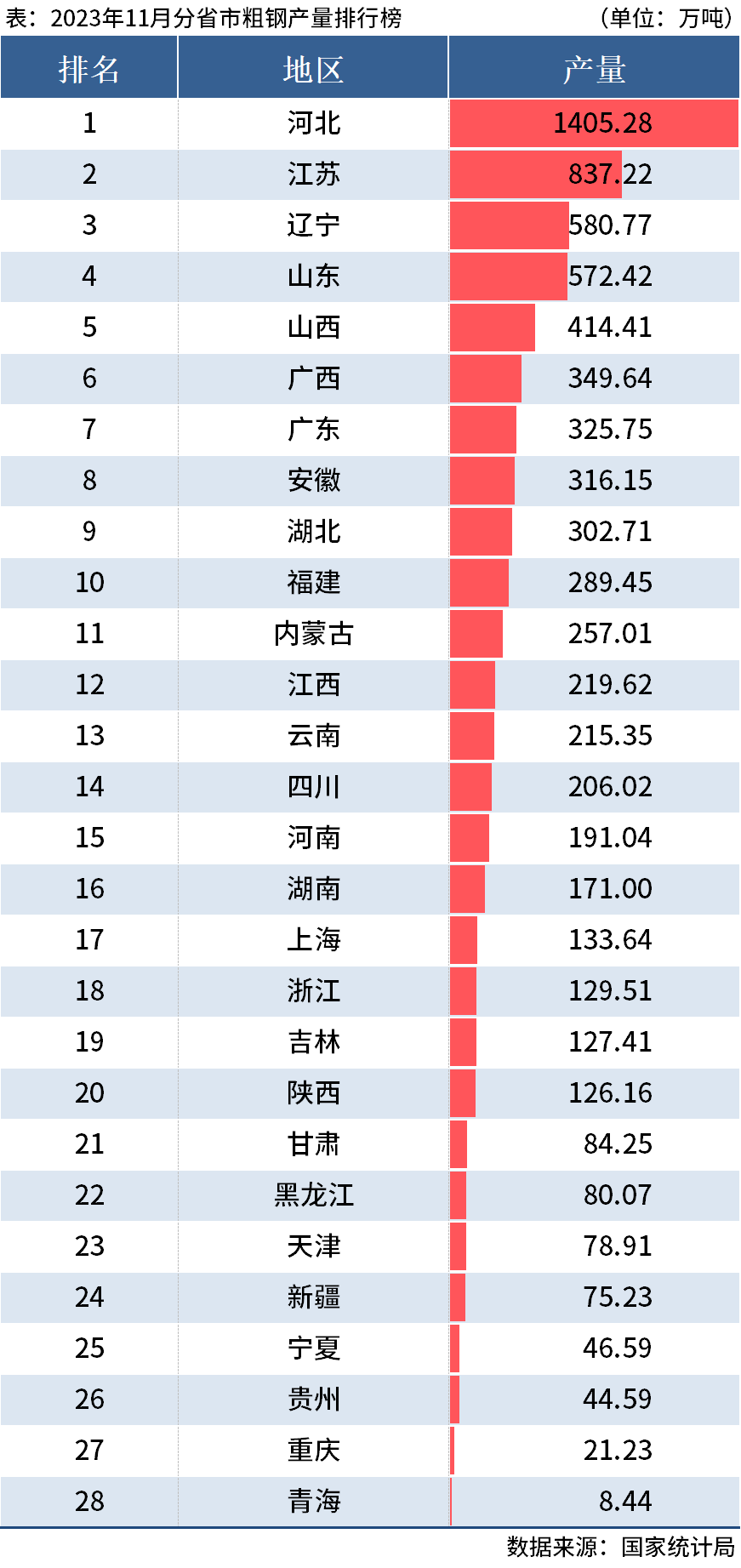 國家統(tǒng)計(jì)局?jǐn)?shù)據(jù)顯示,2023年11月中國粗鋼產(chǎn)量7609.9萬噸,同比增長0.4%;1-11月中國粗鋼產(chǎn)95214.0萬噸,同比增長1.5%。其中,產(chǎn)量排名前二的省份分別是河北和江蘇。具體情況如下: