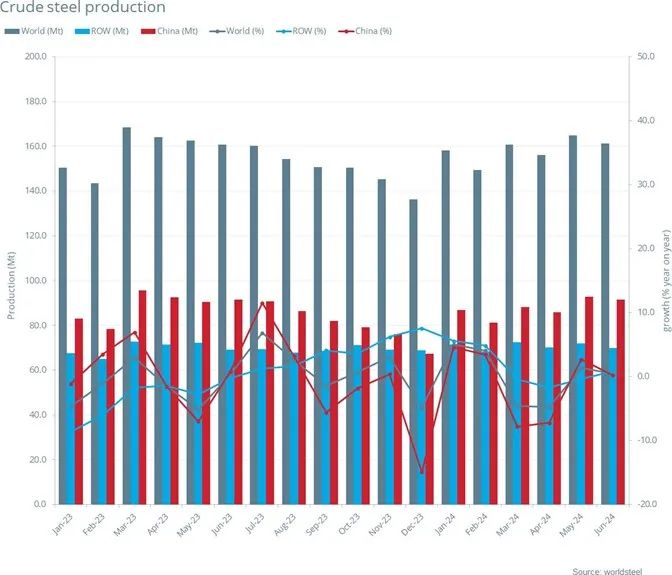 2024年6月全球71個(gè)納入世界鋼鐵協(xié)會(huì)統(tǒng)計(jì)國家的粗鋼產(chǎn)量為1.614億噸,同比提高0.5%。