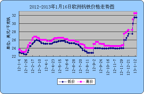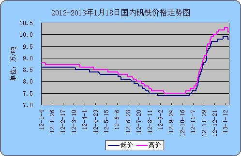 以下分別為2012-2013年1月18日國內外釩鐵價格走勢圖: