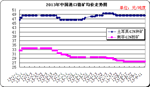 目前土耳其40-42%塊礦報價265-275美元/噸CIF;巴基斯坦40-42%塊礦260-270美元/噸;伊朗40-42%塊礦255-265美元/噸;南非40-42%粉礦150-160美元/噸,南非36-38%塊礦160-170美元/噸;阿曼36-38%塊礦190-195美元/噸。