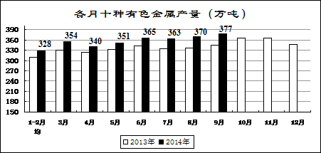 前三季度,全國十種有色金屬產量3195萬噸,同比增長6.6%,增速同比減緩3.2個百分點。電解鋁產量1759萬噸,增長7.8%,減緩0.9個百分點;銅產量增長11%,減緩2個百分點;鉛產量下降5.6%,去年同期為增長6.1%;鋅產量增長4.6%,減緩7.1個百分點。氧化鋁產量增長4.8%,減緩8.2個百分點。