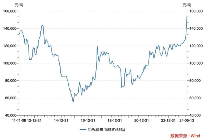 Wind數(shù)據(jù)統(tǒng)計顯示,江西65%品位鎢精礦5月13日均價位為15.35萬元/噸,較年初已上漲25%,創(chuàng)下自2013年以來的新高。