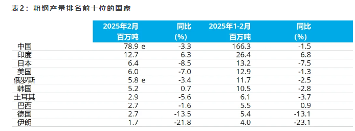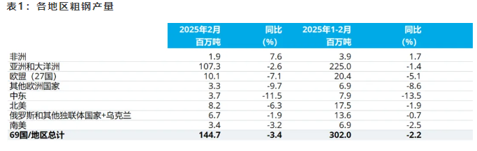 2025年2月全球69個納入世界鋼鐵協會統計國家/地區的粗鋼產量為1.447億噸,同比下降3.4%。