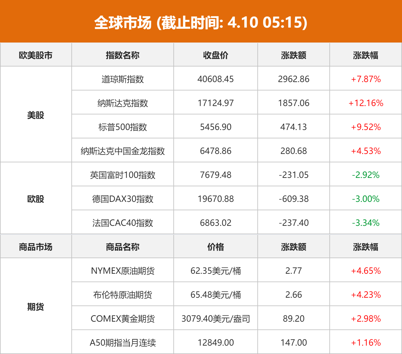 【全球市場(chǎng)】1、特朗普稱已授權(quán)對(duì)不采取報(bào)復(fù)行動(dòng)的國(guó)家實(shí)施90天的關(guān)稅暫停。納指漲12.16%,創(chuàng)歷史第二大單日漲幅;標(biāo)普漲9.52%;道指漲7.87%。2、特斯拉漲超22%,英偉達(dá)漲超18%,蘋果漲超15%。3、納斯達(dá)克中國(guó)金龍指數(shù)漲4.53%,理想汽車、京東漲超6%。4、國(guó)際油價(jià)漲超4%,國(guó)際金價(jià)漲近3%。