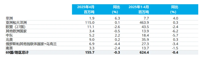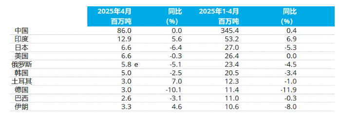 2025年4月全球69個納入世界鋼鐵協會統計國家/地區的粗鋼產量為1.557億噸,同比下降0.3%。