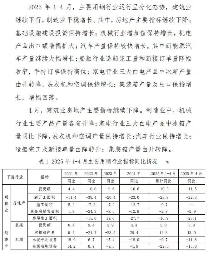 2025年1-4月,主要用鋼行業(yè)運行呈分化態(tài)勢,建筑業(yè)繼續(xù)下行,制造業(yè)平穩(wěn)增長。