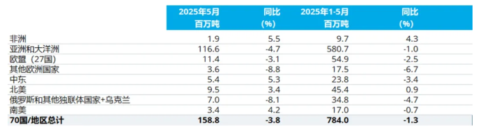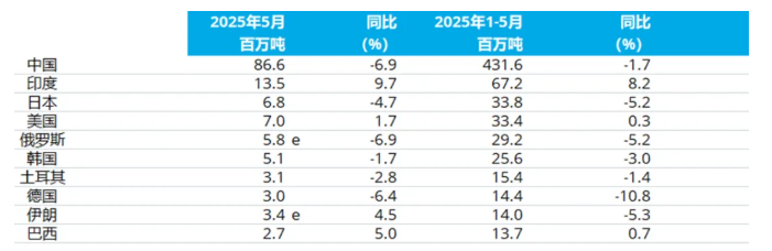 2025年5月全球70個(gè)納入世界鋼鐵協(xié)會統(tǒng)計(jì)國家/地區(qū)的粗鋼產(chǎn)量為1.588億噸,同比下降3.8%。