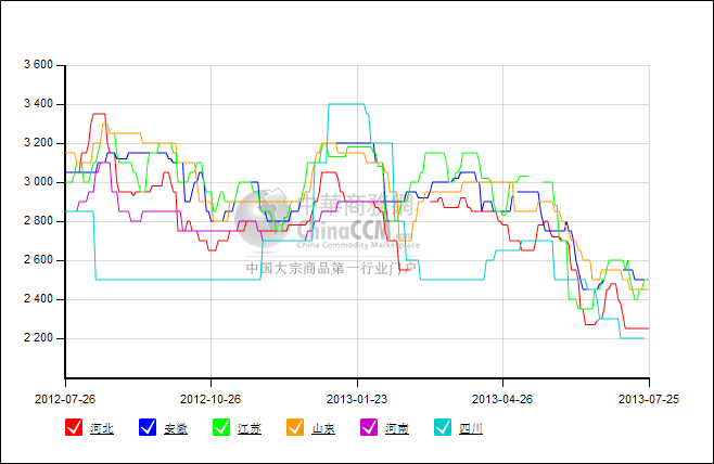 下圖為去年7月至今年7月這一年間主產區液氨價格走勢曲線。四川由于運輸不暢與其他市場相對脫離,因此走勢不具有典型性。但就其他幾省的走勢曲線可清晰的看出,去年同期,主產區主流報價基本圍繞在3000元/噸上下浮動,而一年后的今天甚至已跌至2200元附近。至截稿為止,價格仍存在下滑趨勢,尚無回暖跡象。