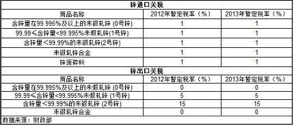 財政部網站日前公布了2013年關稅實施方案,今年鋅進口關稅較去年無變化。