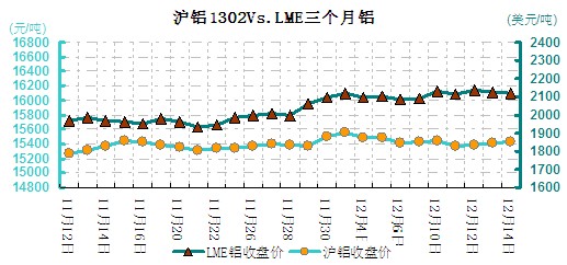 本周(12.10-12.14)宏觀面消息表現(xiàn)平穩(wěn),國內(nèi)鋁錠市場高庫存依然制約著鋁價,市場延續(xù)外強內(nèi)弱行情。從周均價看,LME倫鋁環(huán)比上周上漲1.3%,滬鋁1302合約環(huán)比下跌0.44%,上海現(xiàn)貨鋁環(huán)比下跌0.49%。