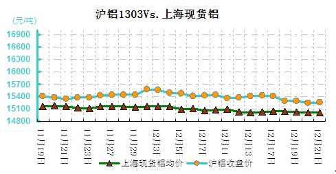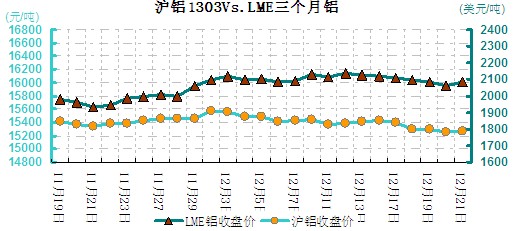 本周(12.17-12.21)總體宏觀面偏弱,國內方面消息平穩,現貨市場鋁錠走勢繼續分化,近期廣東南海鋁錠庫存量下降至15.2萬噸,刺激華南地區價格小幅走高。從周均價看,LME倫鋁環比上周下降1.9%,滬鋁1303合約環比下跌0.56%,上海現貨鋁環比下跌0.1%。
