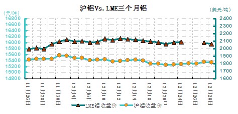 本周(12.24-12.28)國(guó)內(nèi)經(jīng)濟(jì)企穩(wěn)回升,令鋁市需求前景樂(lè)觀,鋁價(jià)小幅上揚(yáng)。不過(guò)隨著美國(guó)隨著財(cái)政懸崖時(shí)間的臨近,目前仍未達(dá)成協(xié)議,使得市場(chǎng)對(duì)于將影響美國(guó)經(jīng)濟(jì)復(fù)蘇腳步的憂(yōu)慮情緒較濃,這在一定程度上對(duì)鋁價(jià)的走勢(shì)形成一定壓制。從周均價(jià)看,LME倫鋁環(huán)比下降0.37%,滬鋁1303合約環(huán)比下跌0.02%,上海現(xiàn)貨鋁環(huán)比上漲0.05%。