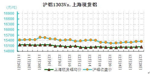 圖二 滬鋁1303VS現(xiàn)貨鋁價(jià)對(duì)比走勢(shì)圖