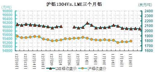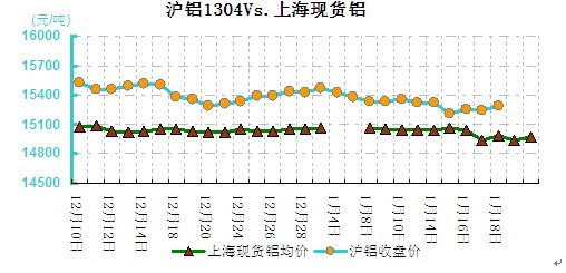 圖二 滬鋁1304VS現貨鋁價對比走勢圖