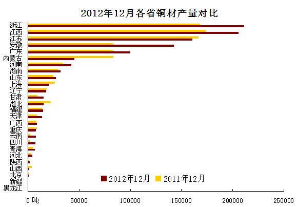 國內(nèi)各省銅材產(chǎn)量2012年12月與2011年12月對比: