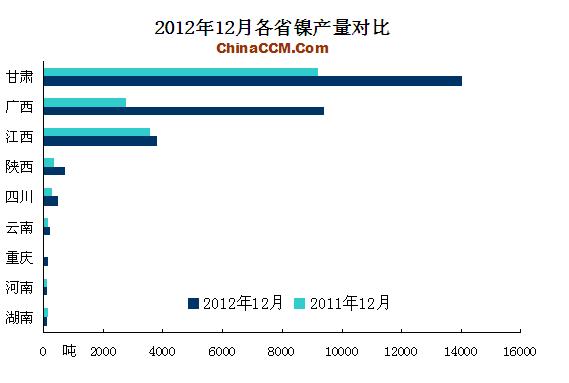 國內(nèi)各省鎳產(chǎn)量2012年12月與2011年12月對比: