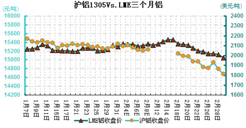 本周LME庫存上升,截止3月1日增加8350噸至5172550噸。滬鋁1305合約周均價環(huán)比下跌1.7%,上海現(xiàn)貨鋁周均價環(huán)比下跌1.4%,上海期貨交易所鋁庫存增加10756噸至482408噸。