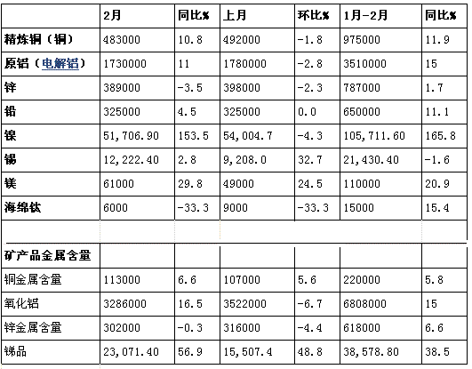 以下是中國國家統計局公布的2月的銅、鋁等基本金屬產量一覽表(單位均為噸,精礦產量以金屬含量計):