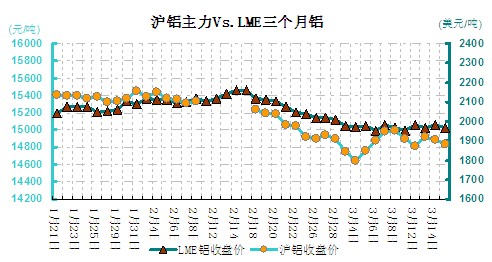 本周LME庫存小幅下滑,截止3月15日減少15825噸至5173075噸。滬鋁主力合約周均價環比上周0.05%,上海現貨鋁周均價環比上漲0.36%,上海期貨交易所鋁庫存增加10355噸至502622噸。