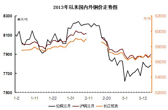 中華商務網訊:本周銅價震蕩中重心略微上揚,如下表所示。周內歐元區工業生產環比降幅超預期,而道指十連陽創歷史新高,美元持續沖高。但因兩市銅庫存不斷走高,逼近歷史高位,銅價注定難以大幅上漲。加之中國國內傳統旺季卻顯慢熱,現貨成交不暢;而周內公布的工業增加值及零售數據又疲弱,銅價反彈空間更加受到打壓。下周,歐元區公布3月PMI初值預計不會好,市場情緒可能進一步受到影響。