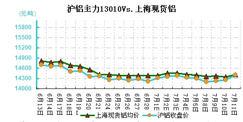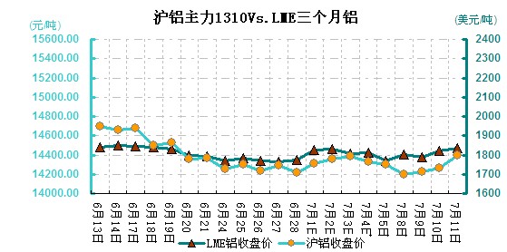 本周(7.8-7.11)外盤鋁價強勢上漲,國內鋁價跟漲乏力,周內公布的經濟數據疲軟以及產能過剩壓力令市場看空后市。從周均價看,LME倫鋁環比上漲0.16%,滬鋁主力合約環比下跌0.5%,上海現貨鋁價環比下跌0.3%。