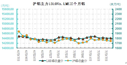 倫鋁本周小幅下挫,波動幅度在1793-1845美元/噸。周一國內二季度GDP增速繼續放緩,市場反應平淡,基本金屬略微震蕩下滑,而美國6月商品零售數據弱于預期以及巴克萊下調美國二季度GDP增速預期,加速基本金屬下滑,倫鋁下跌1.63%至1809.2 美元/噸,之前我們提示倫鋁在1850壓力較大,目前已經觸壓回調。近期幾家投行相繼下調中國GDP預期,基金屬難以走好,周中倫鋁在1800支撐線上方運行。受助于強勁的美經濟數據及美聯儲對縮減寬松貨幣政策將采取靈活態度,截止周四倫鋁收于1804.5美元/噸,目前美元走強及擔憂供應過剩仍令期鋁承壓。國外雖然陸續發布減產消息,但下半年新投產力度將加大,整體而言,國外今年仍為供需平衡。但下半年全球宏觀不宜樂觀的大背景下,尤其是對于基本面相對弱勢的滬鋁(主要來自西北新增產能的大幅投產),將在很長一段時間內以震蕩下跌為主,拖累倫鋁。
