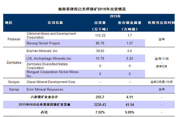 據(jù)菲律賓礦務(wù)局(Mines and Geosciences Bureau,MGB)官方統(tǒng)計,2015年在冊鎳礦山27座,其中南蘇里高省的Claver Mineral Development Corp和Emir Mineral Resources不在其列,其余六家鎳礦企業(yè)都位列其中,了解Claver Mineral Development Corp 2015年并未出貨,結(jié)合MGB數(shù)據(jù),這8家礦企2015年合計出貨量在255.70萬干噸,占到菲律賓總出貨量的7.92%,折合鎳金屬量4.11萬噸,占總量的9.89%。