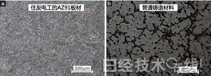 打破這一障礙的企業是住友電工。該公司開發出了“類似漏模造型(Strip Casting)的自主急速冷凝技術”(岸本明),成功使金屬組織的分布細致而且均勻(圖1),由此避免了大尺寸化合物的析出,從而可防止由此引起的材料破碎。盡管詳情未透露,但住友電工新領域技術研究所鎂合金研究室主任河部望表示“關鍵在于在母材中均勻地混合大量鋁并急速冷卻”。