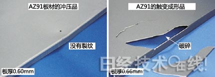 由板材制造的沖壓品不僅適合大量生產,而且具有尺寸精度高、表面缺陷少、強度高等多種優點。比如,住友電工的AZ91沖壓品,其拉伸強度最大可達到380MPa,是鑄造品的1.5倍,延展率高達10%以上。而且,對沖擊的耐受性也很強。在薄板鑄造品被砸碎的沖擊試驗中,相同厚度的沖壓品只出現稍微凹陷,并未出現裂紋(圖2)*2。