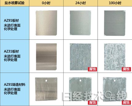 AZ31板材與AZ91鑄造材料在24小時后有明顯腐蝕,而住友電工的AZ91板材在100小時后也沒有明顯的腐蝕。