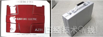 圖為筆記本電腦表面機殼示意圖。采用沖壓技術施以十字加工。右圖是以摩擦攪拌焊接(FSW)工藝將三塊板材焊接成大尺寸板材,再沖壓成形加工成的手提公文箱。這種公文箱已由開發人員日常使用。