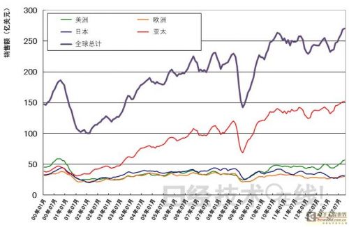 全球及各地區的單月半導體銷售額(3個月的移動平均值)走勢(數據提供:SIA及WSTS;制圖:《日經電子》)。