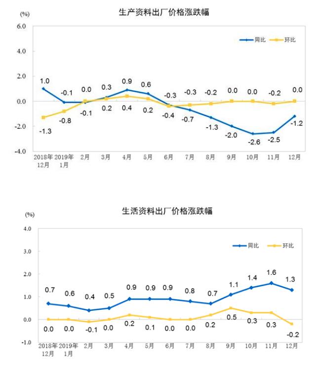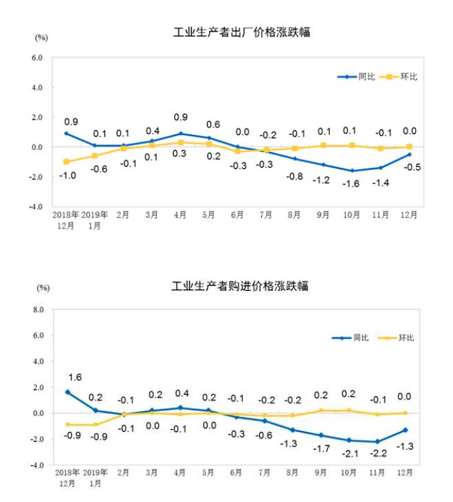 2019年12月份,全國工業(yè)生產(chǎn)者出廠價(jià)格同比下降0.5%,環(huán)比持平;工業(yè)生產(chǎn)者購進(jìn)價(jià)格同比下降1.3%,環(huán)比持平。2019年全年,工業(yè)生產(chǎn)者出廠價(jià)格比上年下降0.3%,工業(yè)生產(chǎn)者購進(jìn)價(jià)格下降0.7%。