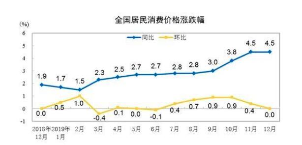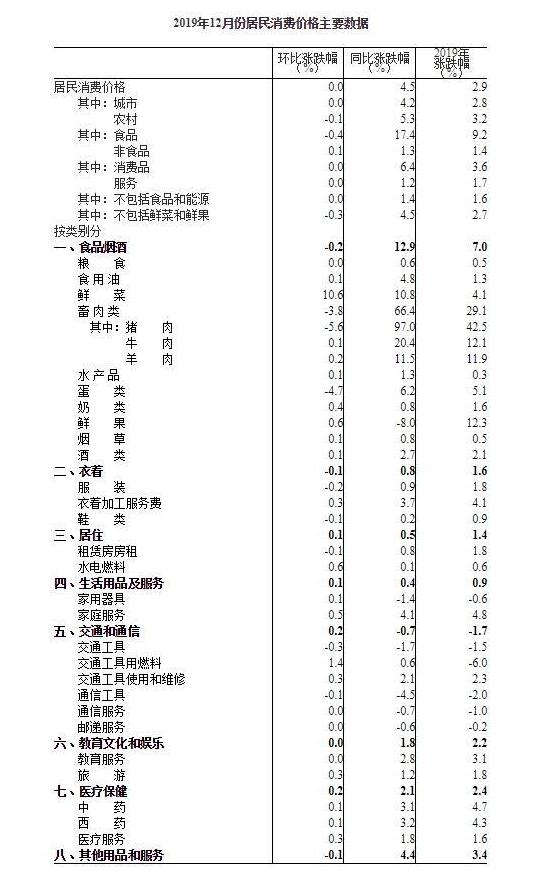 2019年12月份,全國居民消費價格同比上漲4.5%。其中,城市上漲4.2%,農村上漲5.3%;食品價格上漲17.4%,非食品價格上漲1.3%;消費品價格上漲6.4%,服務價格上漲1.2%。2019年全年,全國居民消費價格比上年上漲2.9%。