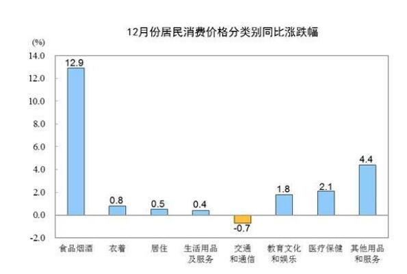 12月份,食品煙酒類價格同比上漲12.9%,影響CPI(居民消費價格指數)上漲約3.82個百分點。食品中,畜肉類價格上漲66.4%,影響CPI上漲約2.94個百分點,其中豬肉價格上漲97.0%,影響CPI上漲約2.34個百分點;鮮菜價格上漲10.8%,影響CPI上漲約0.26個百分點;蛋類價格上漲6.2%,影響CPI上漲約0.04個百分點;水產品價格上漲1.3%,影響CPI上漲約0.02個百分點;糧食價格上漲0.6%,影響CPI上漲約0.01個百分點;鮮果價格下降8.0%,影響CPI下降約0.15個百分點。