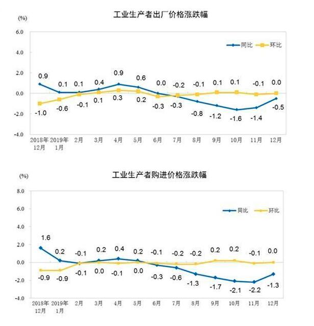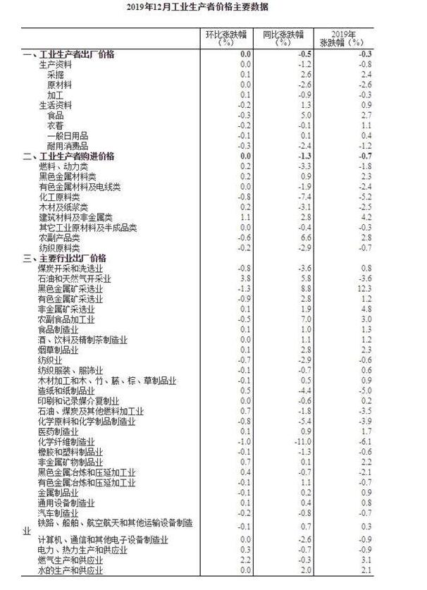 2019年12月份,全國工業生產者出廠價格同比下降0.5%,環比持平;工業生產者購進價格同比下降1.3%,環比持平。2019年全年,工業生產者出廠價格比上年下降0.3%,工業生產者購進價格下降0.7%。