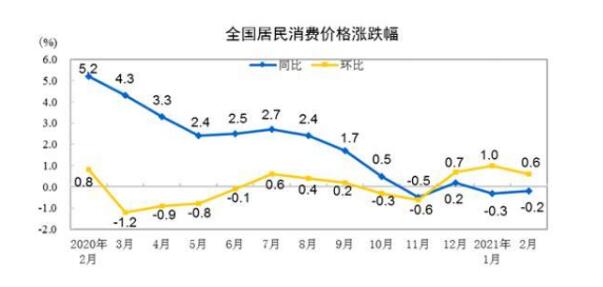 2月份,全國居民消費價格環比上漲0.6%。其中,城市上漲0.6%,農村上漲0.4%;食品價格上漲1.6%,非食品價格上漲0.4%;消費品價格上漲0.7%,服務價格上漲0.4%。