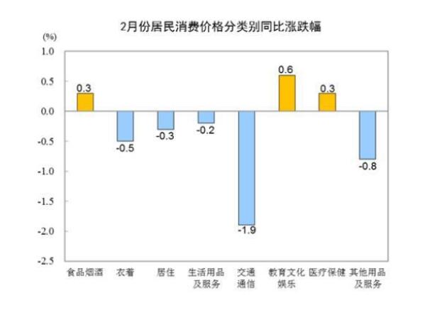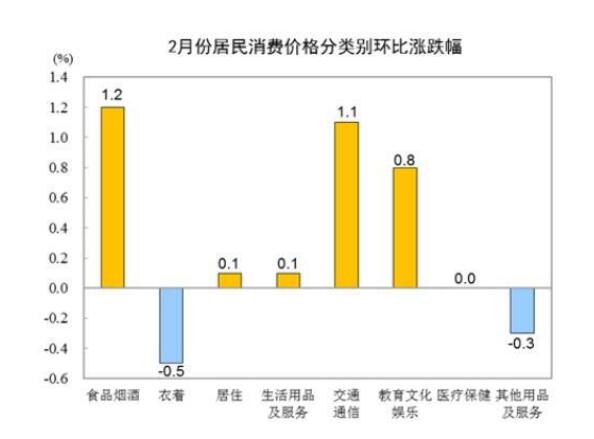 2月份,食品煙酒類價格同比上漲0.3%,影響CPI(居民消費價格指數)上漲約0.09個百分點。食品中,水產品價格上漲5.9%,影響CPI上漲約0.11個百分點;鮮菜價格上漲3.3%,影響CPI上漲約0.08個百分點;鮮果價格上漲3.1%,影響CPI上漲約0.06個百分點;蛋類價格上漲3.0%,影響CPI上漲約0.02個百分點;糧食價格上漲1.4%,影響CPI上漲約0.02個百分點;畜肉類價格下降7.3%,影響CPI下降約0.34個百分點,其中豬肉價格下降14.9%,影響CPI下降約0.39個百分點。