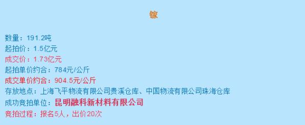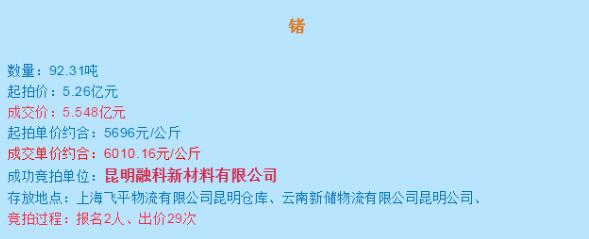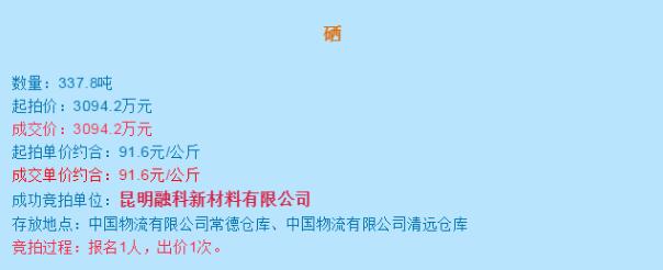 硒、鎵、鍺全部被昆明融科新材料有限公司拍得。全部約7.59億元。而據悉,這家公司是今年9月4日才剛剛注冊的公司。