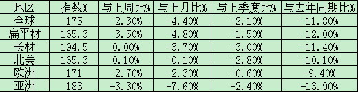 上周國際鋼市疲軟。CRU國際鋼價綜合指數為175,低于前一周的179.1。CRU扁平材指數為165.3,低于前一周的171.4;CRU長材指數為194.5,維持前一周水平。其中,歐洲市場CRU價格指數為171,低于前一周的175.7;北美市場CRU價格指數為165.3,高于前一周的165.1;亞洲市場CRU價格指數為183,低于前一周的189.2。