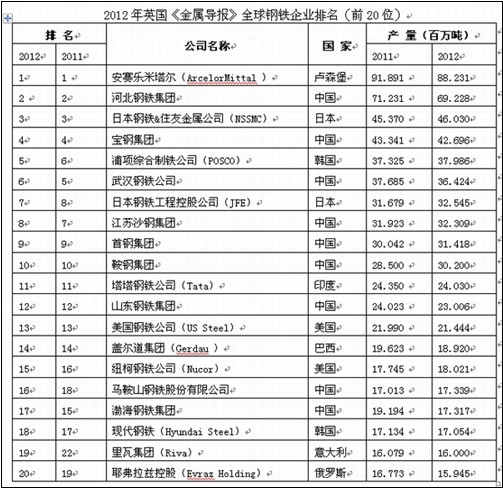 排名第一的盧森堡ArcelorMittal公司,2012年粗鋼產(chǎn)量較2011年減少了約370萬噸,下降4%,降至8823萬噸。