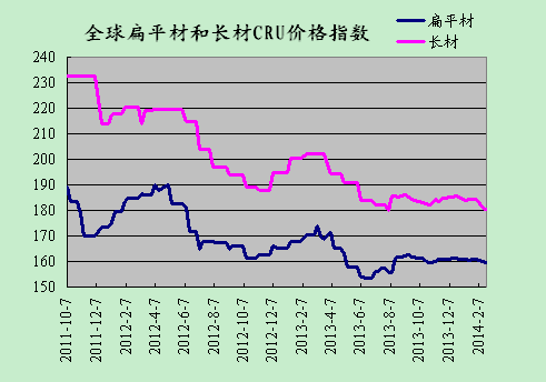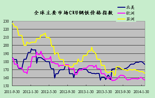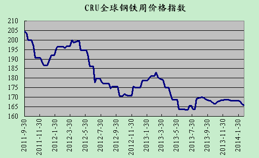 上周國際鋼市整體走低。CRU國際鋼價綜合指數為165.85,CRU扁平材指數為159.4,CRU長材指數為180.24。其中北美市場CRU價格指數為176.42,歐洲市場CRU價格指數為157.14,亞洲市場CRU價格指數為165.85。
