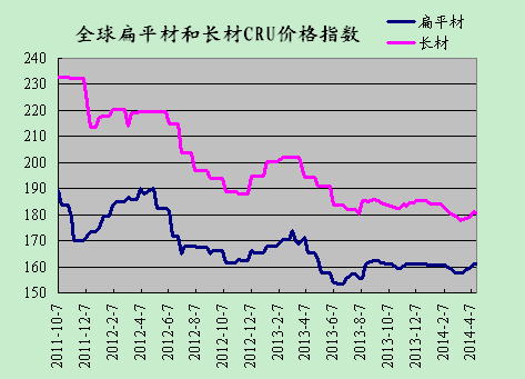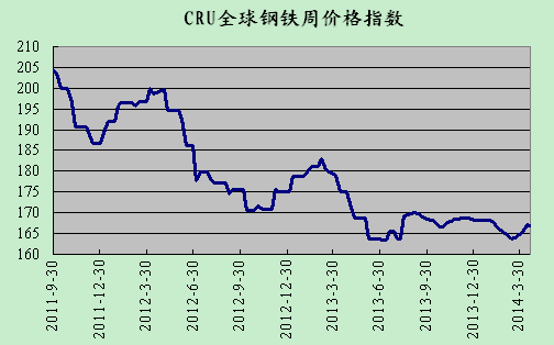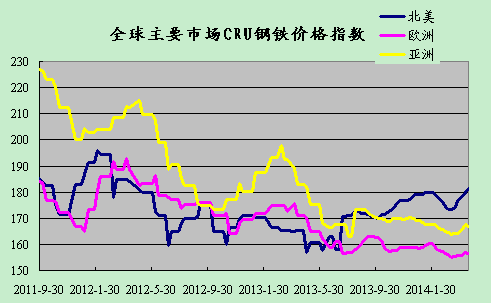 上周國際鋼市漲跌不一。CRU國際鋼價綜合指數為167,CRU扁平材指數為161.17,CRU長材指數為180.57。北美市場CRU價格指數為181.28,歐洲市場CRU價格指數為156.56,亞洲市場CRU價格指數為166.85。