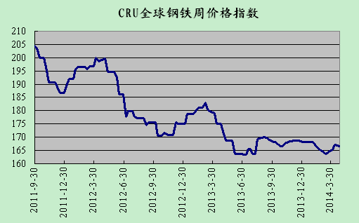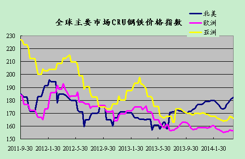 上周國際鋼市整體走低。CRU國際鋼價綜合指數為166.72,CRU扁平材指數為161.09,CRU長材指數為179.99。北美市場CRU價格指數為182.01,歐洲市場CRU價格指數為156.56,亞洲市場CRU價格指數為166.05。