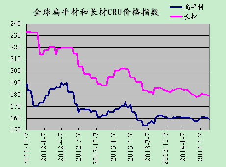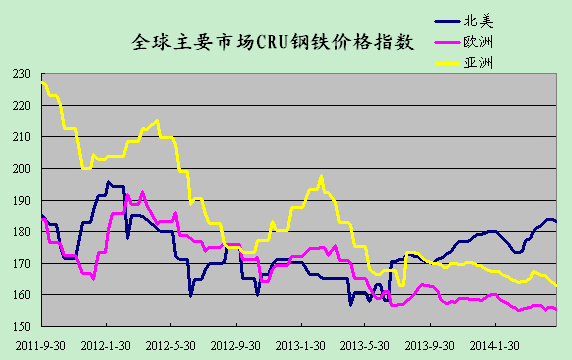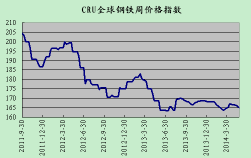 上周國際鋼市全面走低。CRU國際鋼價綜合指數為165.11,CRU扁平材指數為159.23,CRU長材指數為178.67。北美市場CRU價格指數為183.12,歐洲市場CRU價格指數為155.38,亞洲市場CRU價格指數為162.97。