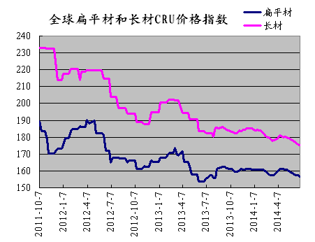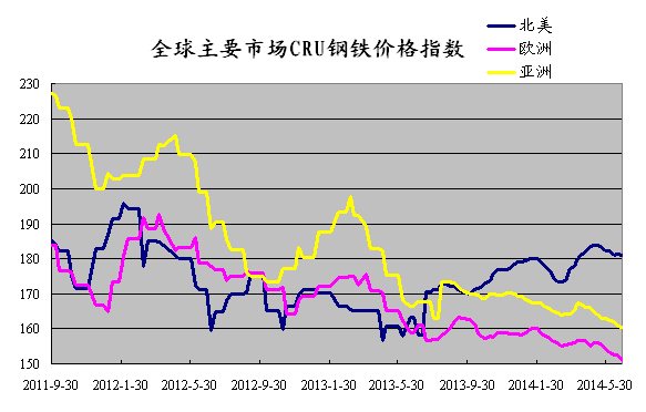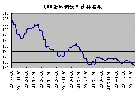 上周國際鋼市繼續全面走低。CRU國際鋼價綜合指數為162.1,CRU扁平材指數為156.43,CRU長材指數為175.29。北美市場CRU價格指數為180.93,歐洲市場CRU價格指數為150.95,亞洲市場CRU價格指數為160.38。