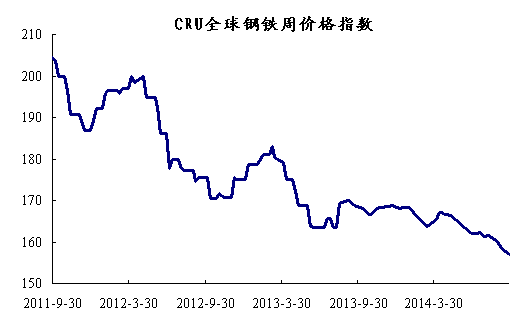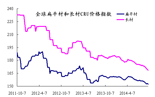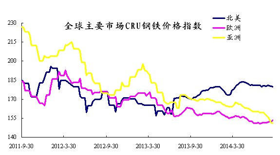 上周國際鋼市繼續整體走低。CRU國際鋼價綜合指數為156.96,CRU扁平材指數為152.929,CRU長材指數為168.57,北美市場CRU價格指數為179.74,歐洲市場CRU價格指數為153.62,亞洲市場CRU價格指數為149.23。