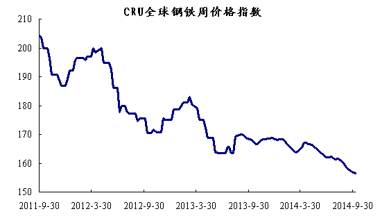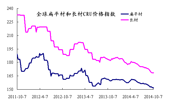 上周國際鋼市繼續(xù)整體走低。CRU國際鋼價(jià)綜合指數(shù)為156.58,CRU扁平材指數(shù)為151.73,CRU長材指數(shù)為168.45,北美市場CRU價(jià)格指數(shù)為178.15,歐洲市場CRU價(jià)格指數(shù)為153.75,亞洲市場CRU價(jià)格指數(shù)為148.92。